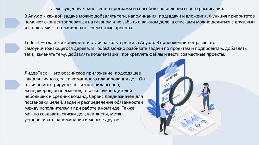 Также существует множество программ и способов составления своего расписания.В Any.do к каждой задаче можно добавлять теги, напоминания, подзадачи и вложения. Функция приоритетов