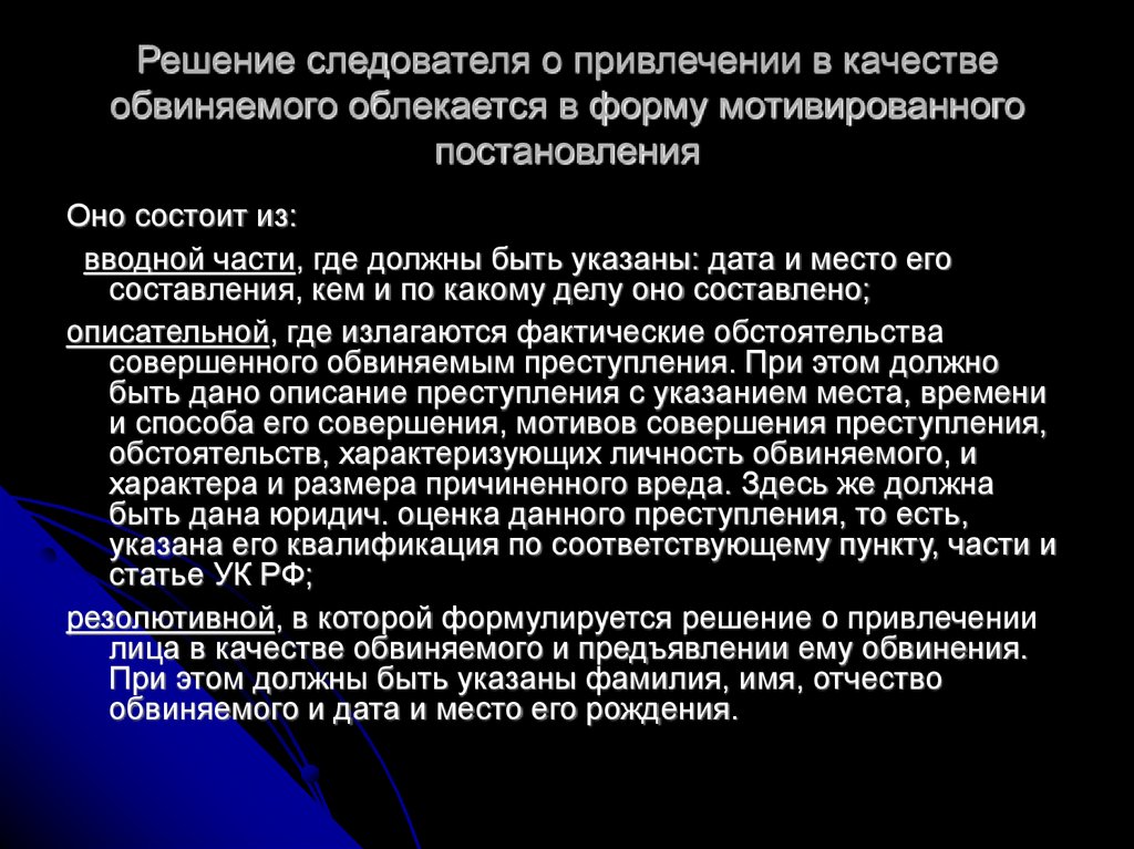 Следователь выносит мотивированное постановлениео привлечении в качестве обвиняемого, и это