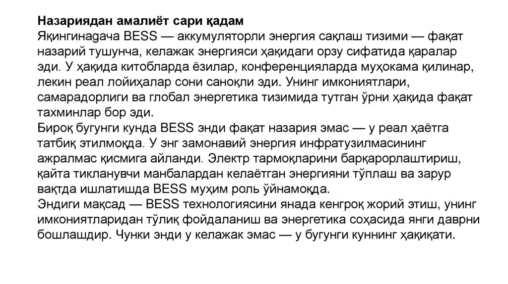 Назариядан амалиёт сари қадамЯқингинаgача BESS — аккумуляторли энергия сақлаш тизими — фақат
