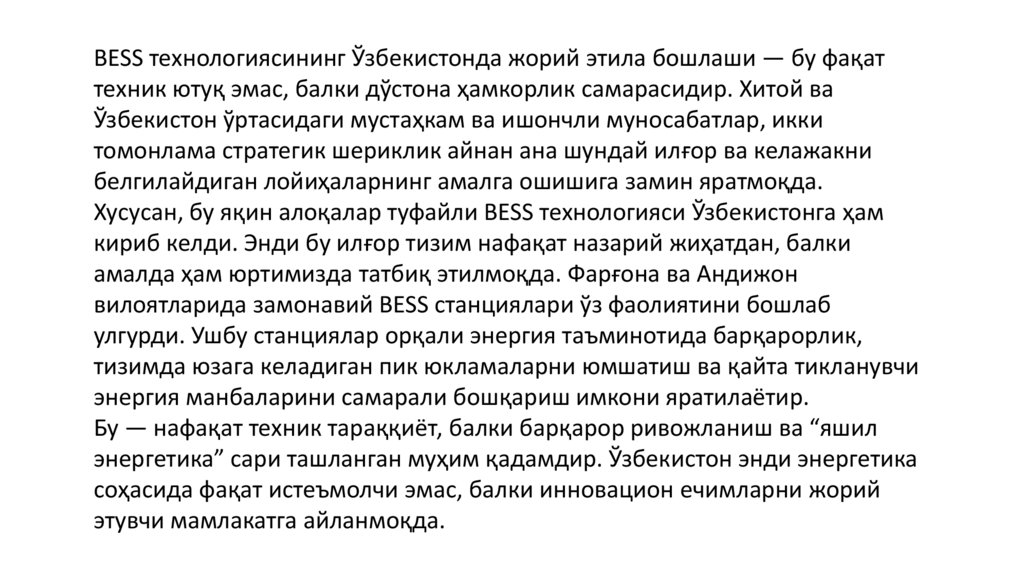 Хусусан, бу яқин алоқалар туфайли BESS технологияси Ўзбекистонга ҳам