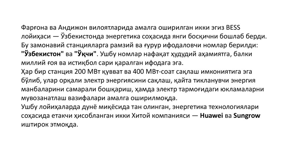 Фарғона ва Андижон вилоятларида амалга оширилган икки эгиз BESSлойиҳаси — Ўзбекистонда энергетика соҳасида янги босқични бошлаб берди.