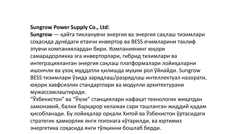 ишончли ва узоқ муддатли қилишда муҳим рол ўйнайди. Sungrow