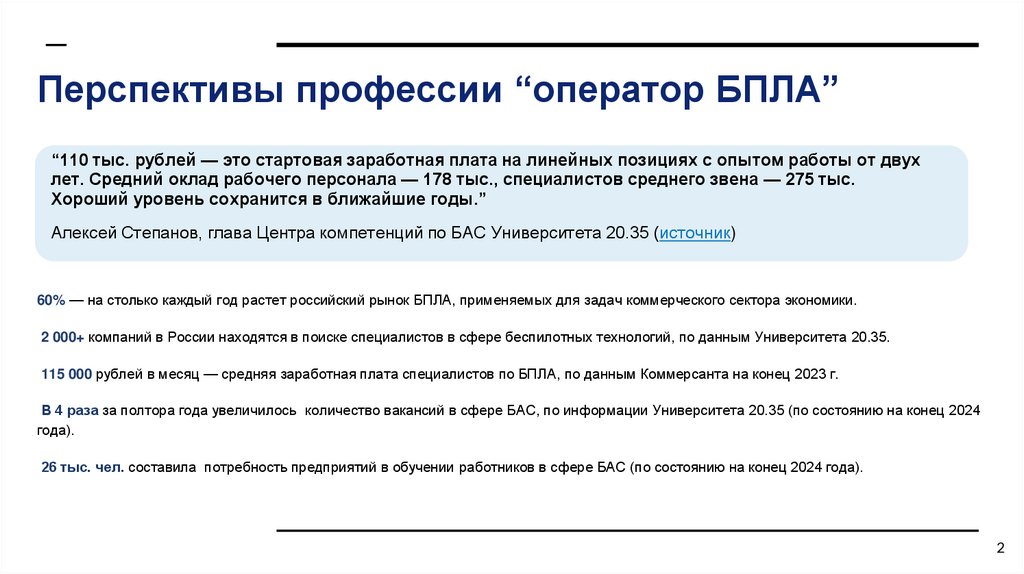 Перспективы профессии “оператор БПЛА”“110 тыс. рублей — это стартовая заработная плата на линейных позициях с опытом работы от двух
