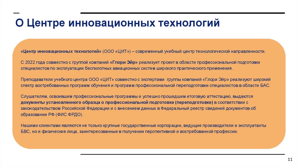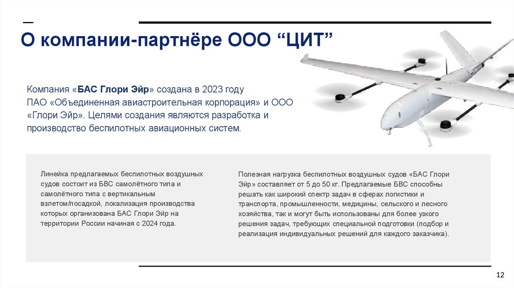 О компании-партнёре ООО “ЦИТ”Компания «БАС Глори Эйр» создана в 2023 году