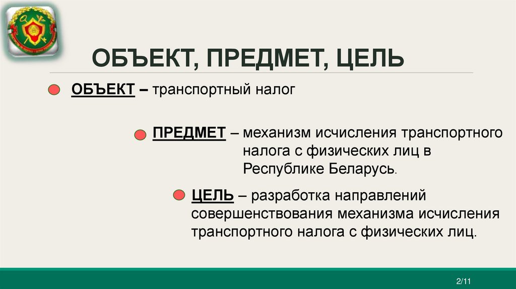 ОБЪЕКТ – транспортный налогПРЕДМЕТ – механизм исчисления транспортного