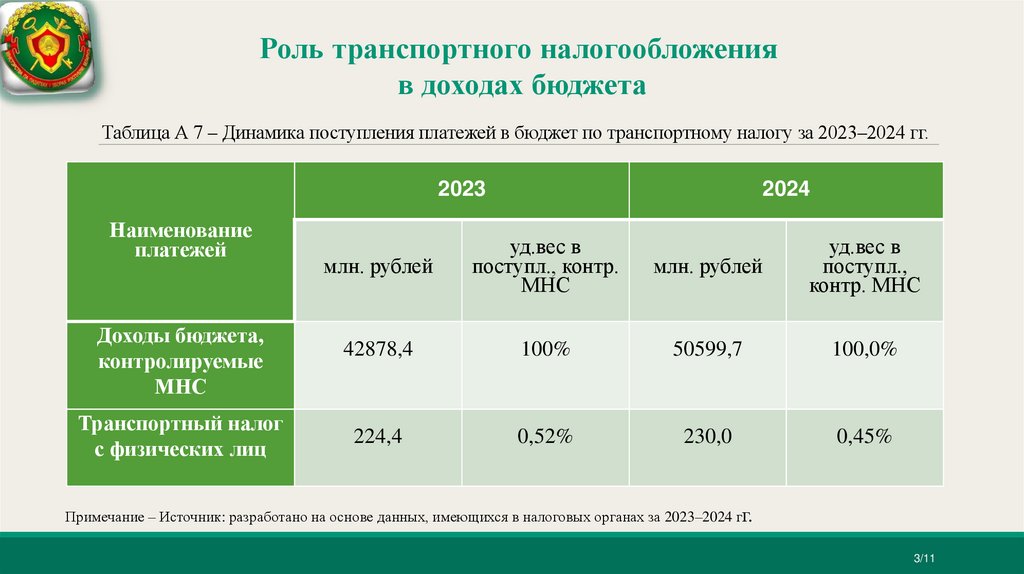 Таблица А 7 – Динамика поступления платежей в бюджет по транспортному налогу за 2023–2024 гг.