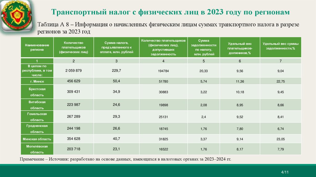 Транспортный налог с физических лиц в 2023 году по регионамТаблица А 8 – Информация о начисленных физическим лицам суммах транспортного налога в разрезе
