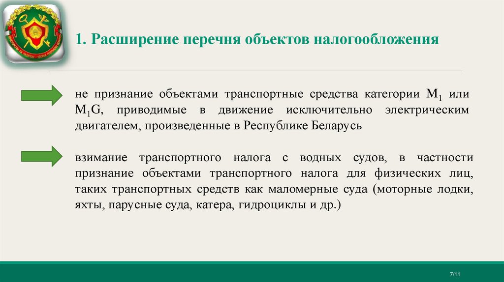 1. Расширение перечня объектов налогообложенияне признание объектами транспортные средства категории M1 или