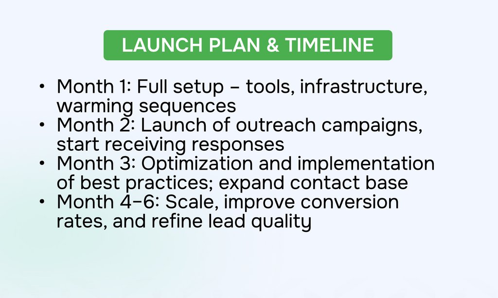 Launch Plan & TimelineMonth 1: Full setup – tools, infrastructure,