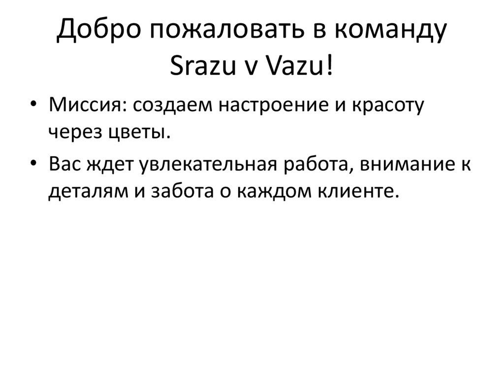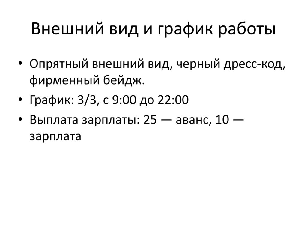 Внешний вид и график работы• Опрятный внешний вид, черный дресс-код,