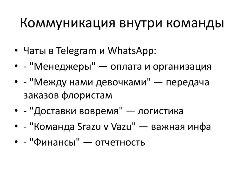 Коммуникация внутри команды• Чаты в Telegram и WhatsApp: