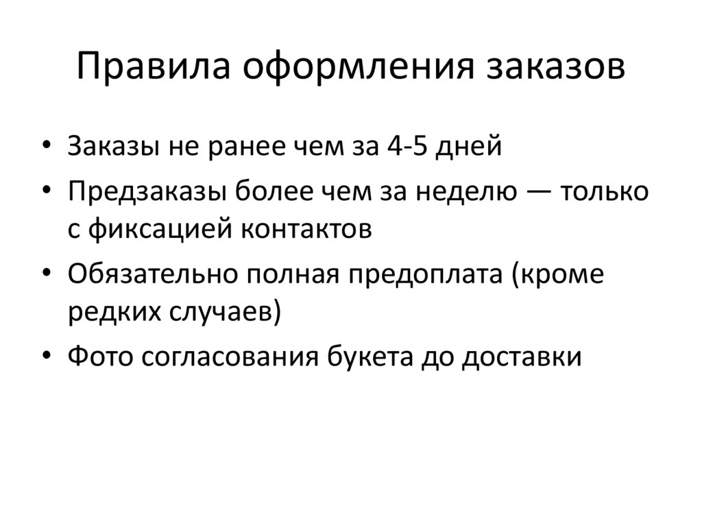 Правила оформления заказов• Заказы не ранее чем за 4-5 дней
