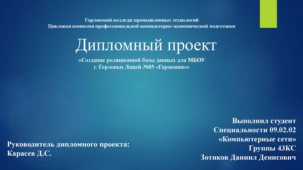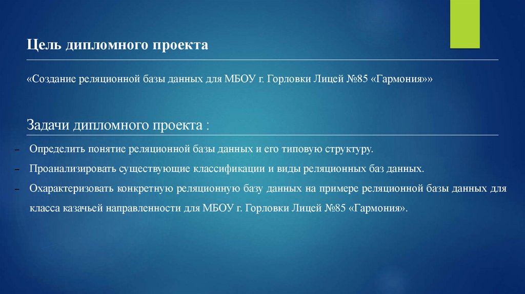 Цель дипломного проекта«Создание реляционной базы данных для МБОУ г. Горловки Лицей №85 «Гармония»»