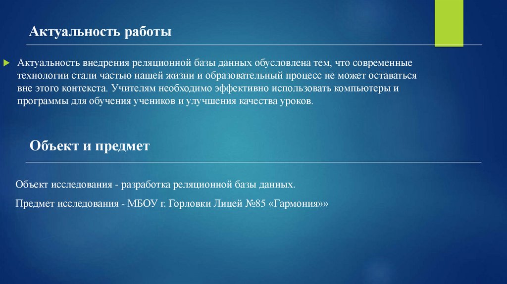 Создание реляционной базы данных для МБОУ г. Горловки Лицей №85 «Гармония»