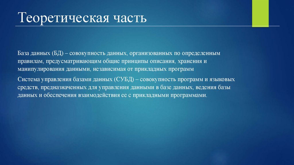 Теоретическая частьБаза данных (БД) – совокупность данных, организованных по определенным
