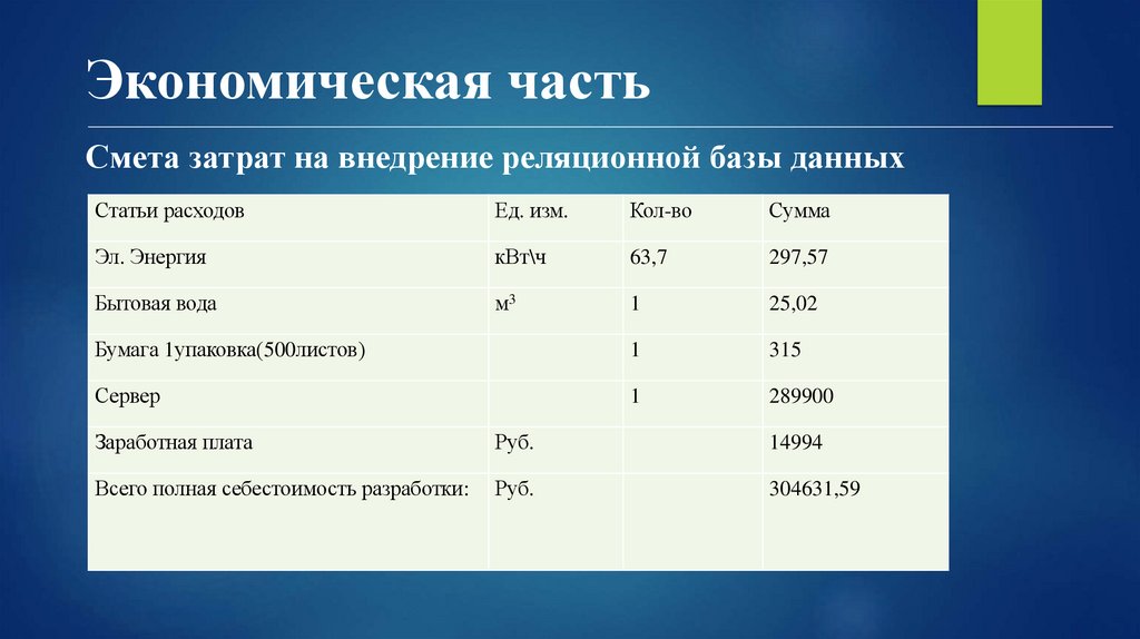 Экономическая частьСмета затрат на внедрение реляционной базы данных