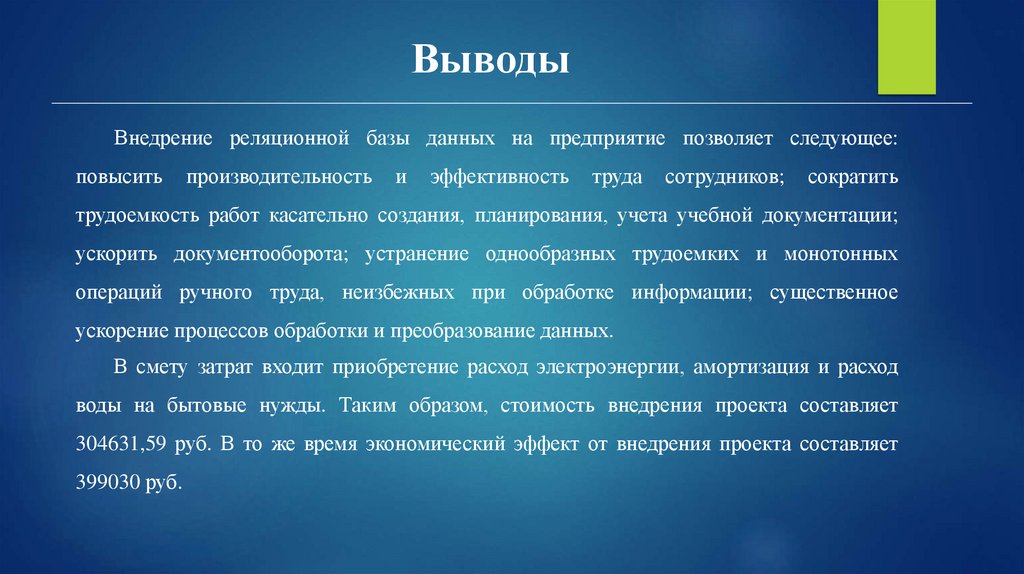 ВыводыВнедрение реляционной базы данных на предприятие позволяет следующее: