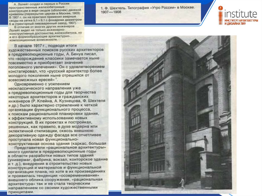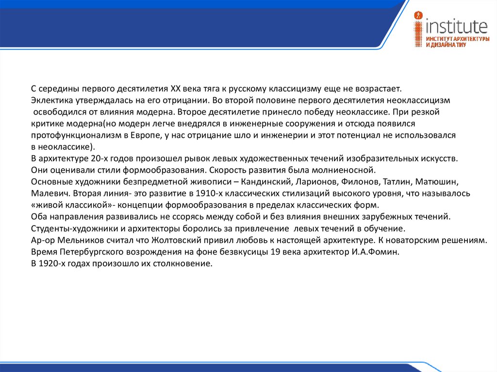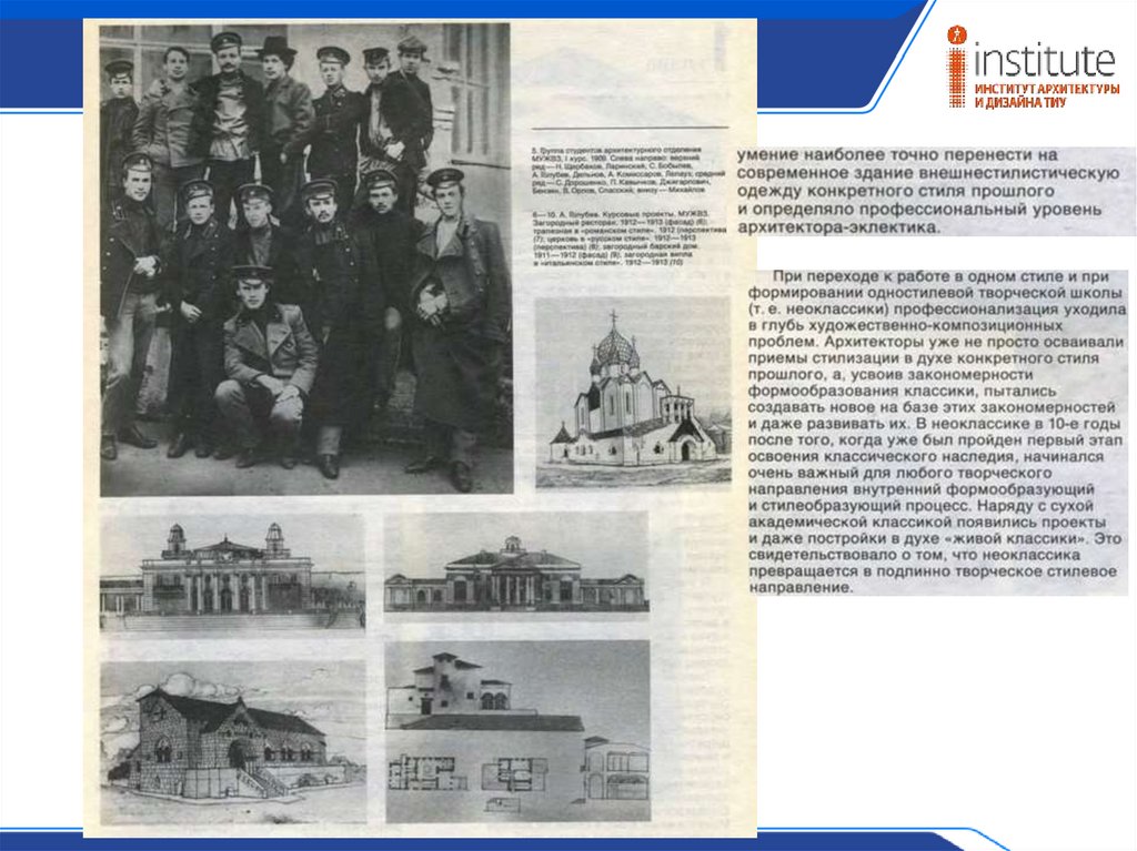 С середины первого десятилетия ХХ века тяга к русскому классицизму еще не возрастает.Эклектика утверждалась на его отрицании. Во второй половине первого десятилетия неоклассицизм