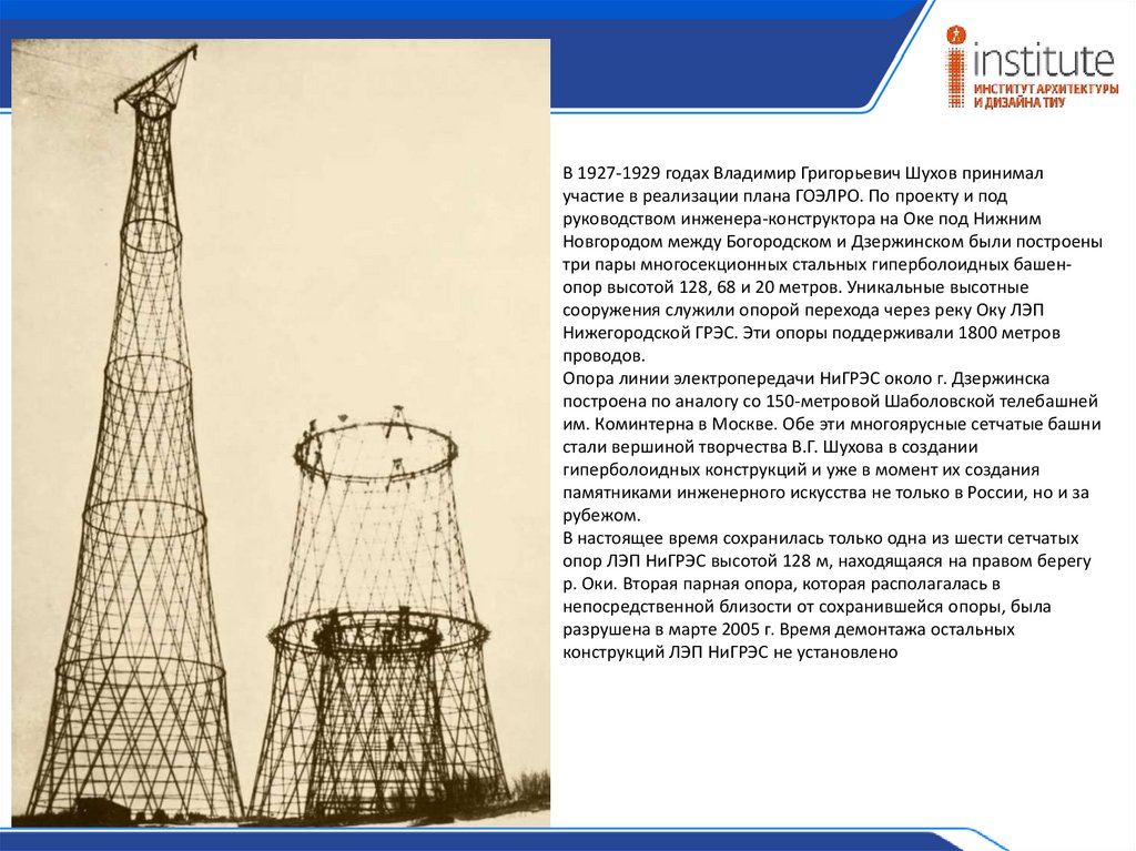 В 1927-1929 годах Владимир Григорьевич Шухов принималучастие в реализации плана ГОЭЛРО. По проекту и под