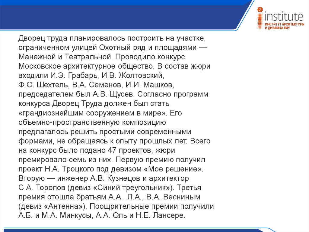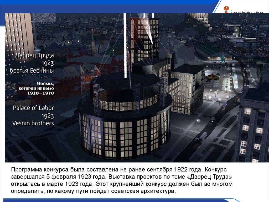 Программа конкурса была составлена не ранее сентября 1922 года. Конкурсзавершался 5 февраля 1923 года. Выставка проектов по теме «Дворец Труда»