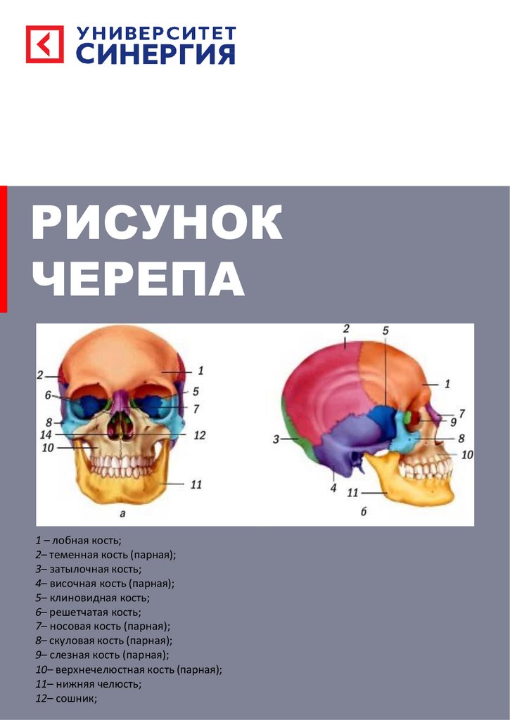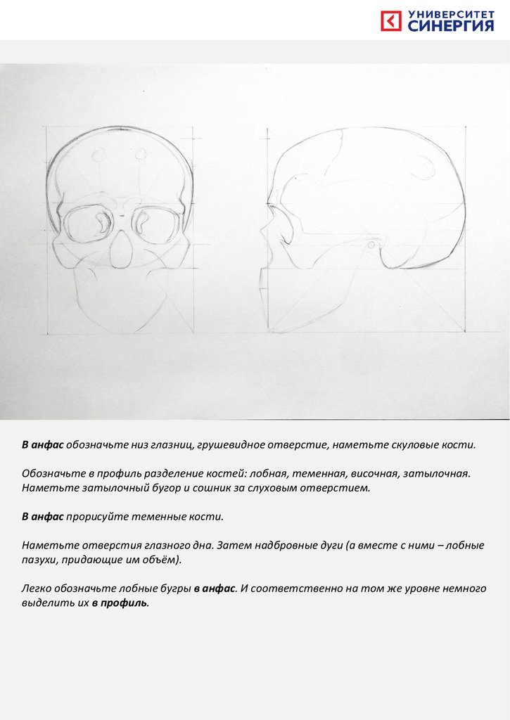 В анфас обозначьте низ глазниц, грушевидное отверстие, наметьте скуловые кости.Обозначьте в профиль разделение костей: лобная, теменная, височная, затылочная.
