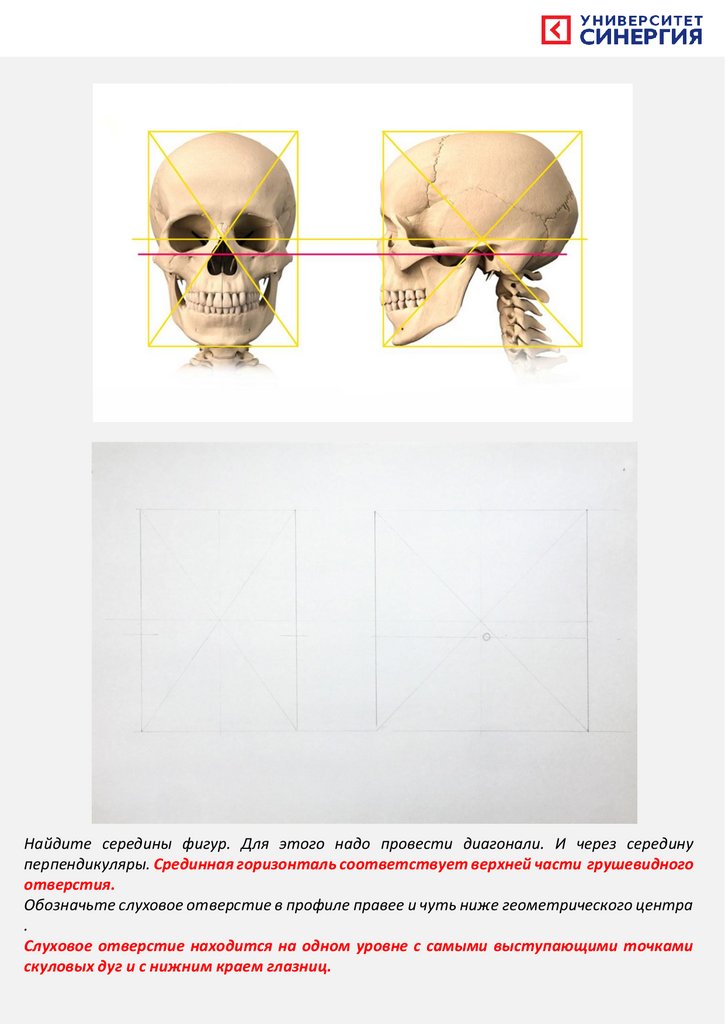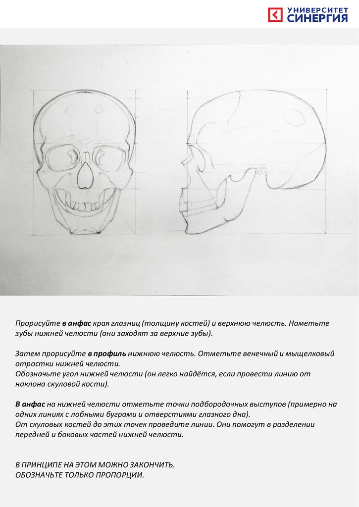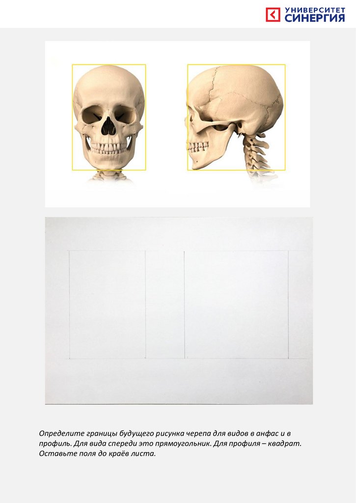 Определите границы будущего рисунка черепа для видов в анфас и впрофиль. Для вида спереди это прямоугольник. Для профиля – квадрат.