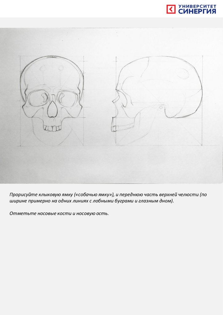 Прорисуйте клыковую ямку («собачью ямку»), и переднюю часть верхней челюсти (поширине примерно на одних линиях с лобными буграми и глазным дном).