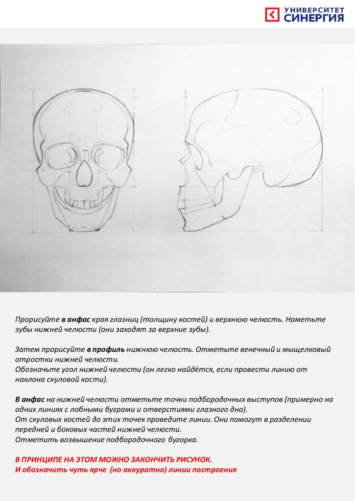 Прорисуйте в анфас края глазниц (толщину костей) и верхнюю челюсть. Наметьтезубы нижней челюсти (они заходят за верхние зубы).