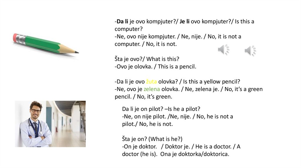 -Ne, ovo je zelena olovka. / Ne, zelena je. / No, it’s a green
