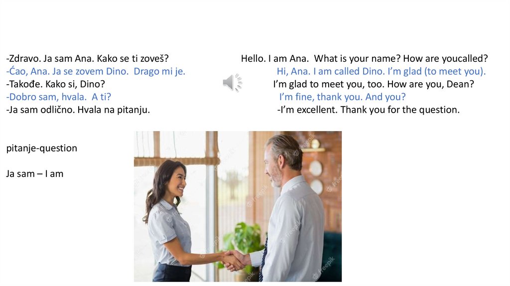 -Zdravo. Ja sam Ana. Kako se ti zoveš?-Ćao, Ana. Ja se zovem Dino. Drago mi je.