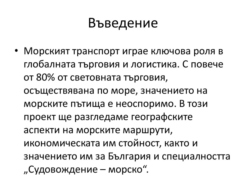 Въведение• Морският транспорт играе ключова роля в