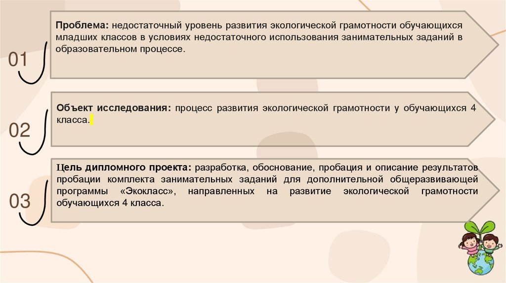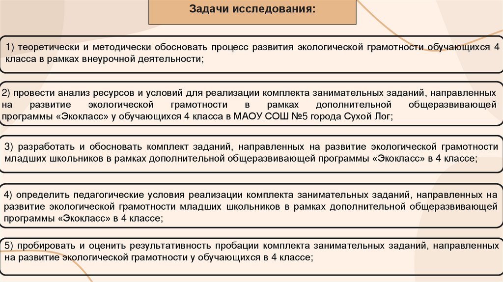 Задачи исследования:1) теоретически и методически обосновать процесс развития экологической грамотности обучающихся 4