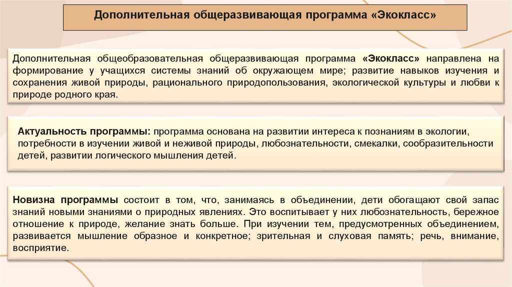 Дополнительная общеразвивающая программа «Экокласс»Дополнительная общеобразовательная общеразвивающая программа «Экокласс» направлена на