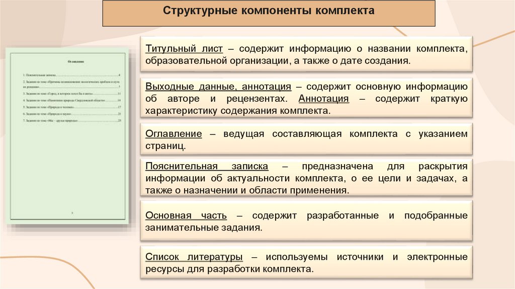 Структурные компоненты комплектаТитульный лист – содержит информацию о названии комплекта,