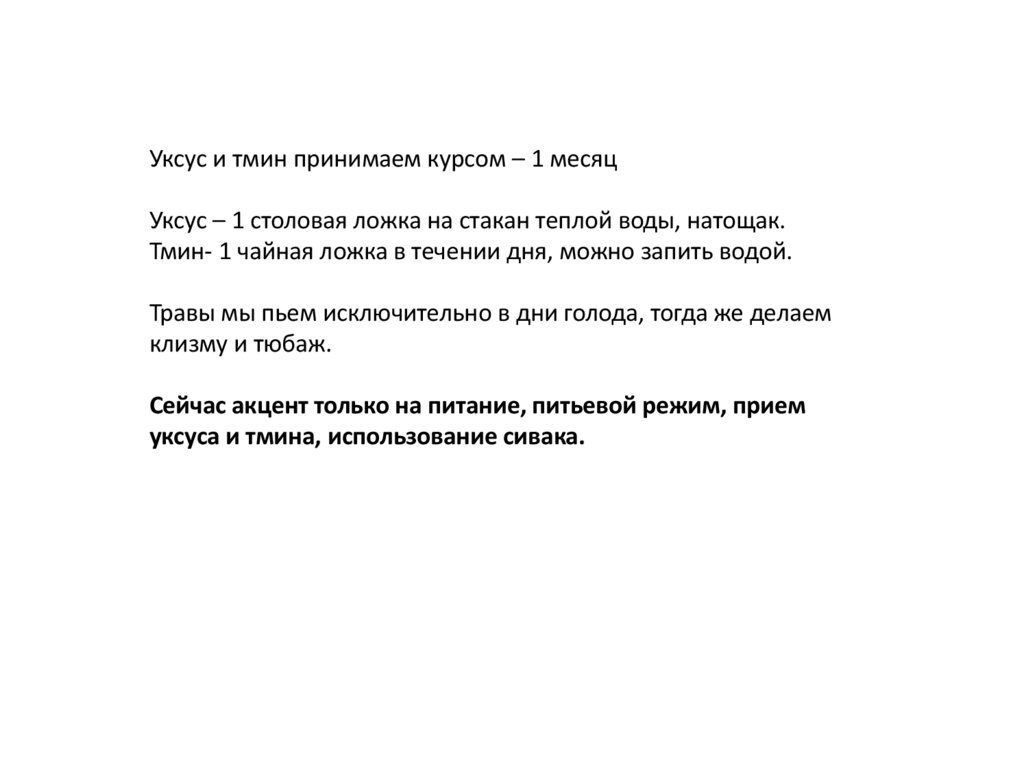 Уксус и тмин принимаем курсом – 1 месяцУксус – 1 столовая ложка на стакан теплой воды, натощак.