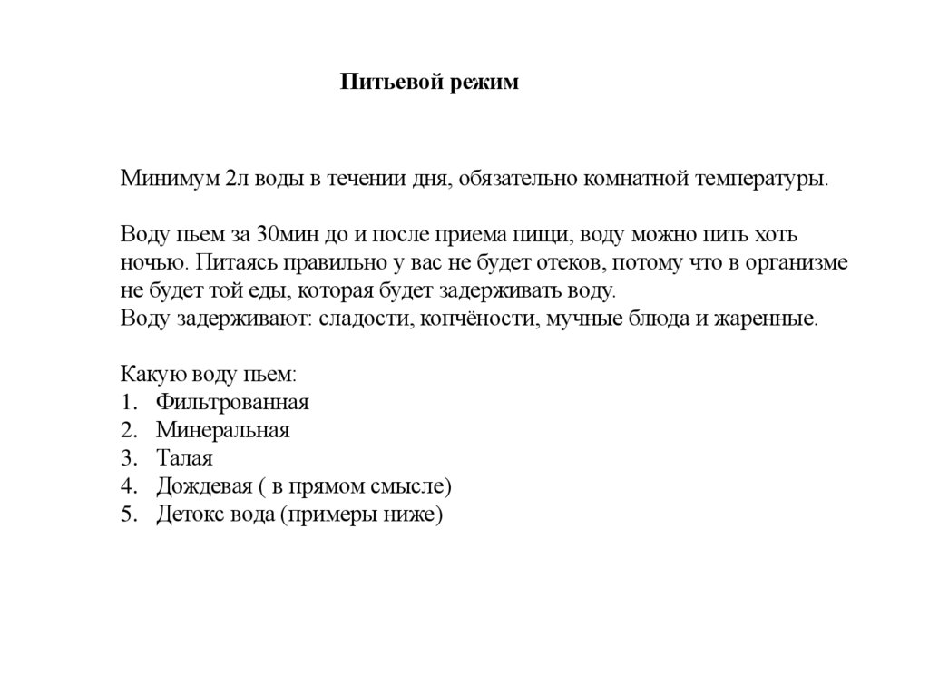 Питьевой режимМинимум 2л воды в течении дня, обязательно комнатной температуры.