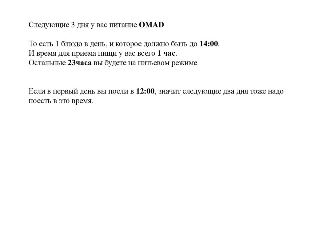 Следующие 3 дня у вас питание OMADТо есть 1 блюдо в день, и которое должно быть до 14:00.