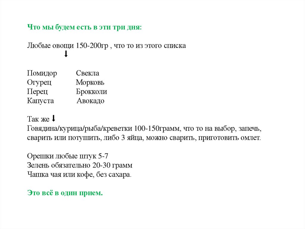 Что мы будем есть в эти три дня:Любые овощи 150-200гр , что то из этого списка