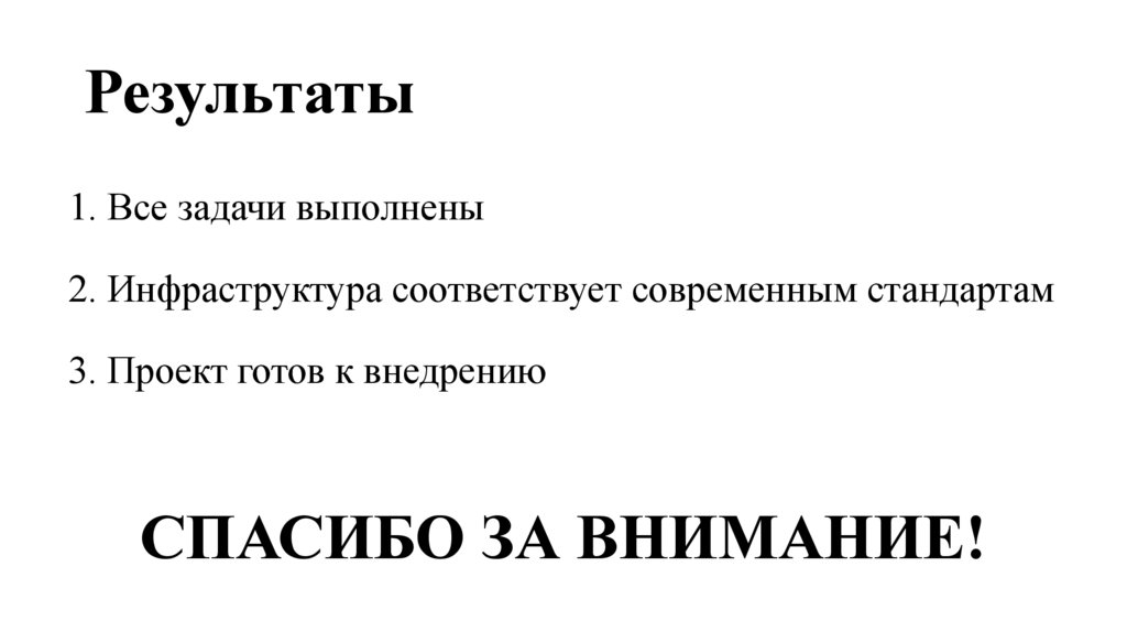 1. Все задачи выполнены2. Инфраструктура соответствует современным стандартам