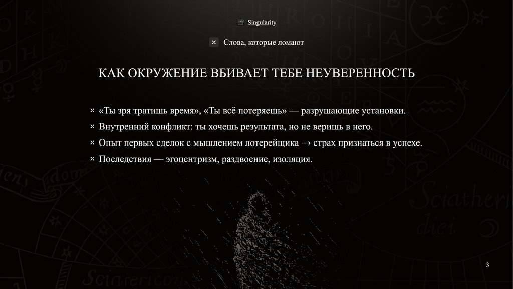 «Ты зря тратишь время», «Ты всё потеряешь» — разрушающие установки.