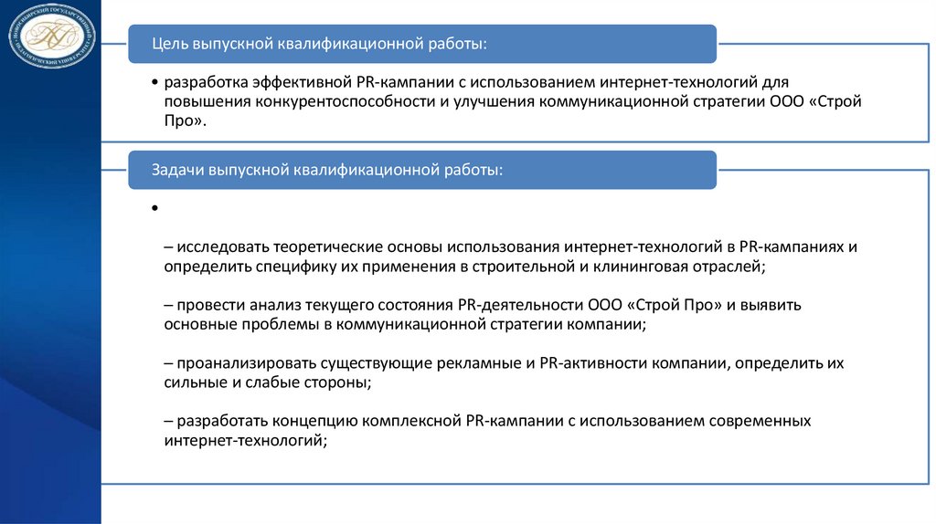 Цель выпускной квалификационной работы:• разработка эффективной PR-кампании с использованием интернет-технологий для
