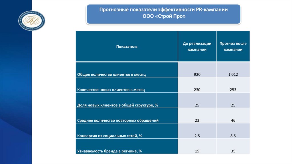Прогнозные показатели эффективности PR-кампанииООО «Строй Про»