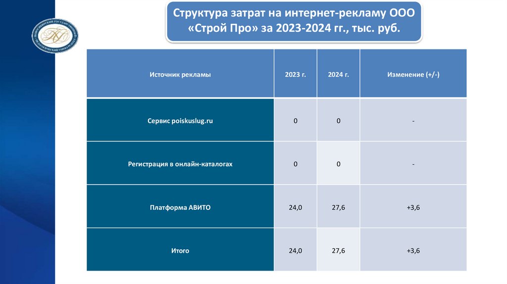 Структура затрат на интернет-рекламу ООО«Строй Про» за 2023-2024 гг., тыс. руб.