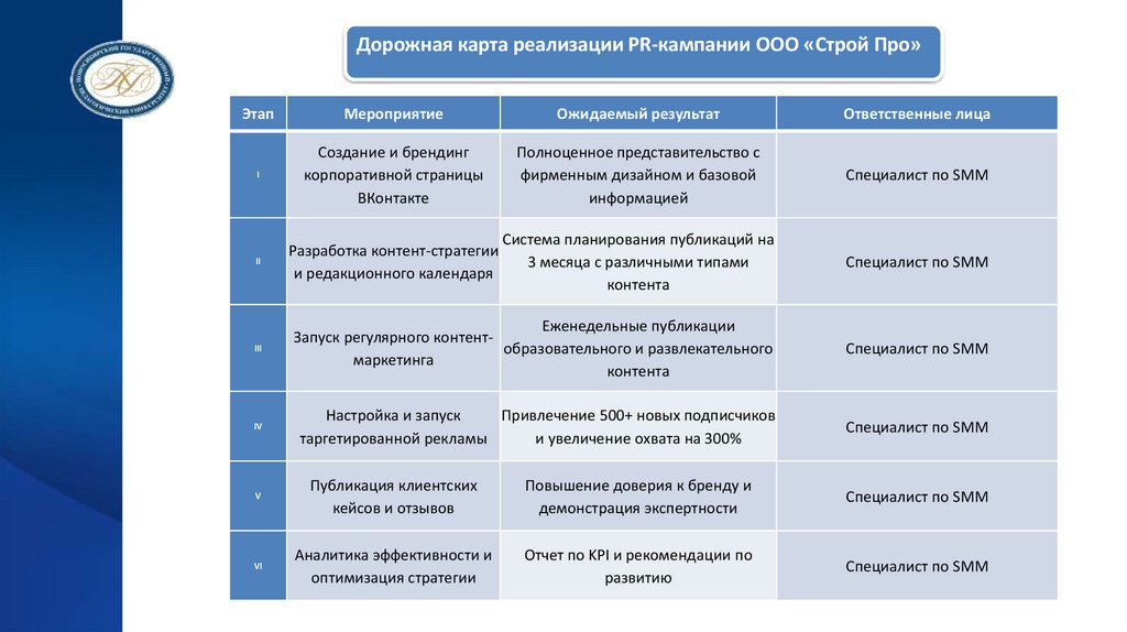 Дорожная карта реализации PR-кампании ООО «Строй Про»Этап