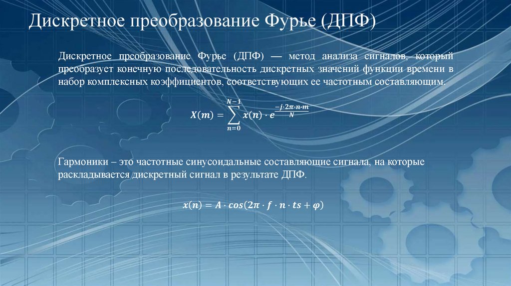 Дискретное преобразование Фурье (ДПФ)Дискретное преобразование Фурье (ДПФ) — метод анализа сигналов, который
