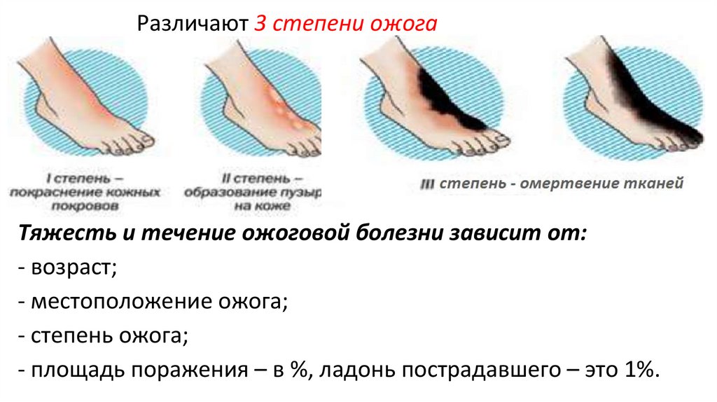 Различают 3 степени ожогаТяжесть и течение ожоговой болезни зависит от: