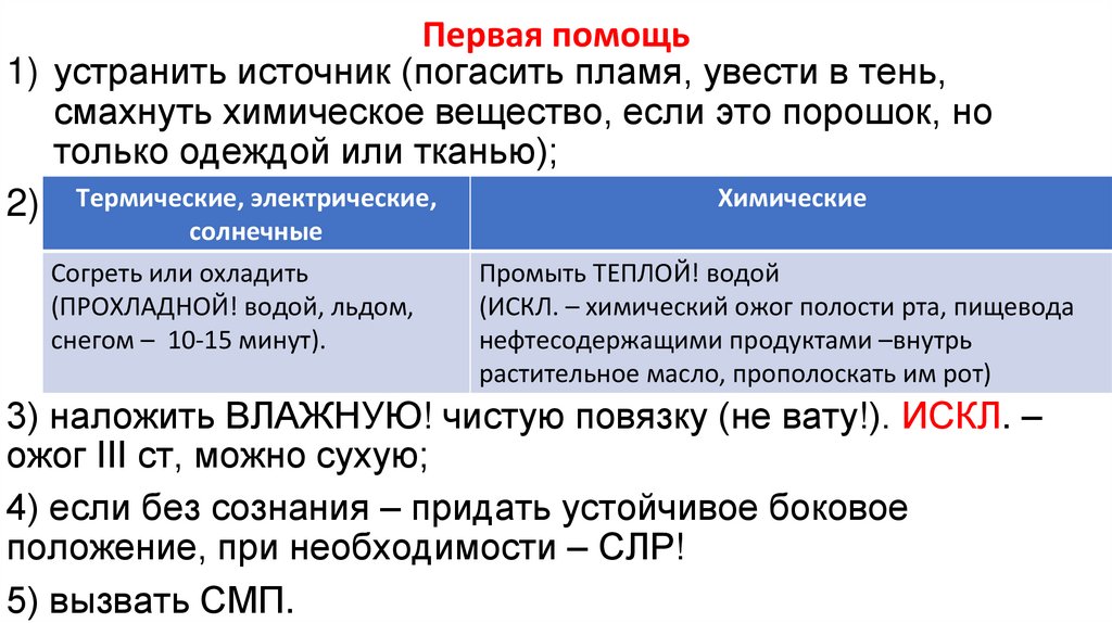 Первая помощь1) устранить источник (погасить пламя, увести в тень,