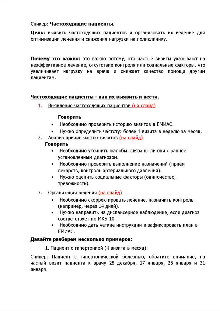 Спикер: Частоходящие пациенты.Цель: выявить частоходящих пациентов и организовать их ведение для