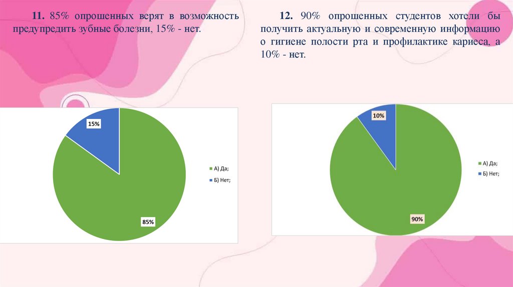 11. 85% опрошенных верят в возможностьпредупредить зубные болезни, 15% - нет.