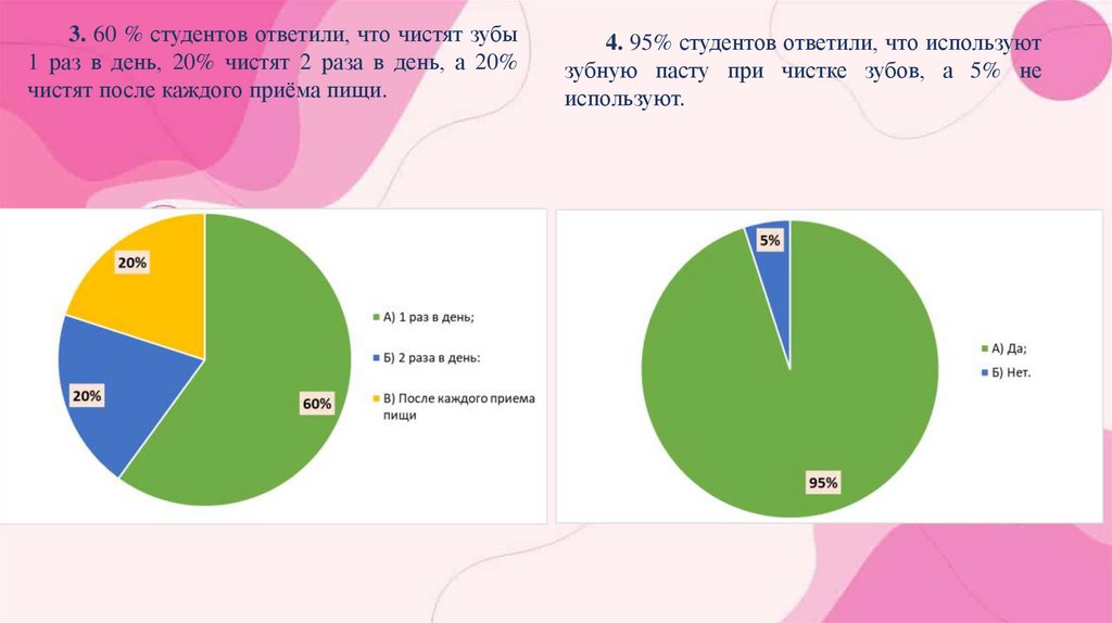 3. 60 % студентов ответили, что чистят зубы1 раз в день, 20% чистят 2 раза в день, а 20%